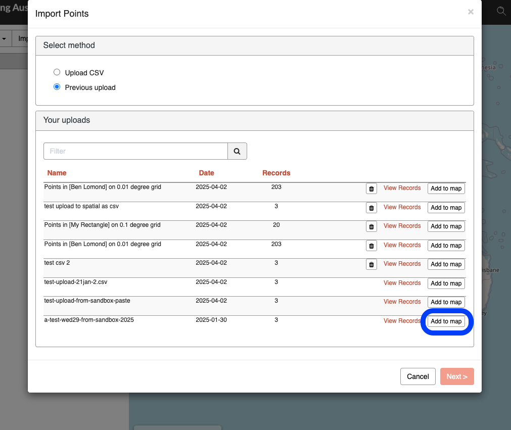 1. To add a previous upload to the map, select ‘Previous upload’, if it's not already selected.