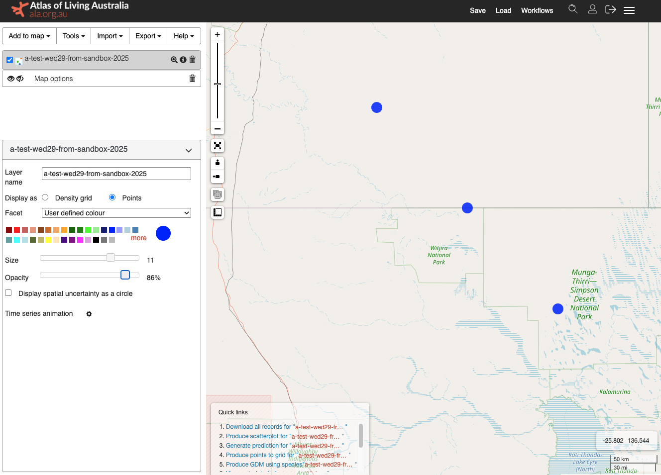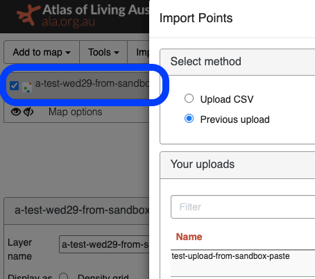 You can import points into the ALA Spatial Portal using a CSV file, or by selecting a prior upload.