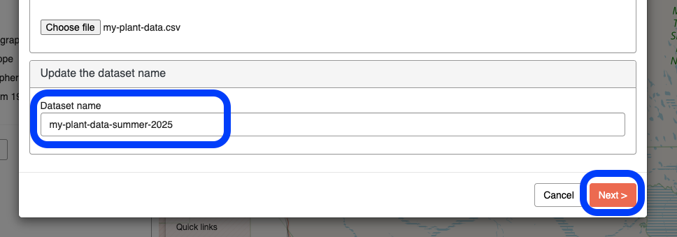 3. The dataset name will automatically populate from the file name. If needed, you can edit here. Then, click Next.