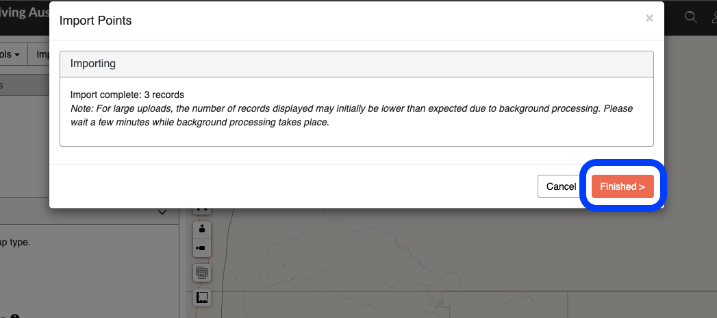 4. It may take a few minutes for the data to import, and the status message will update during this time. Once complete, a success message will be shown, e.g. "Import complete: 3 records". Click Finished to exit the popup window and return to the map.